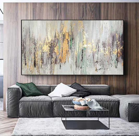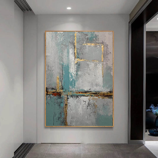 Cuadro Pintado a Mano textura , abstracto turquesa , dorado y grises