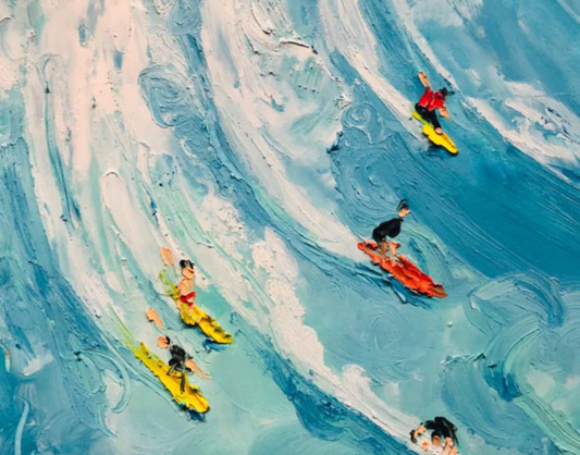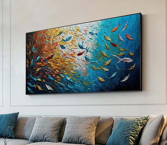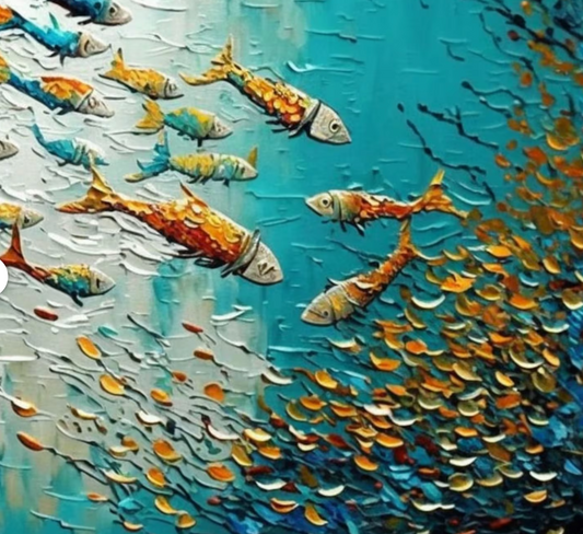 Cuadro Pintado a Mano textura , peces en cardumen estilo Chino 2