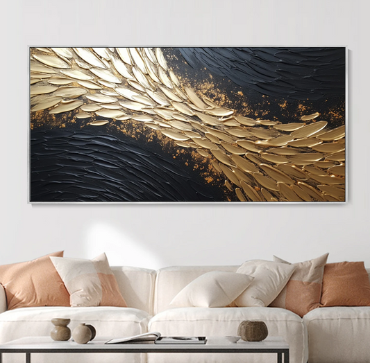 Cuadro Pintado a Mano textura , Ondas doradas sobre negro.