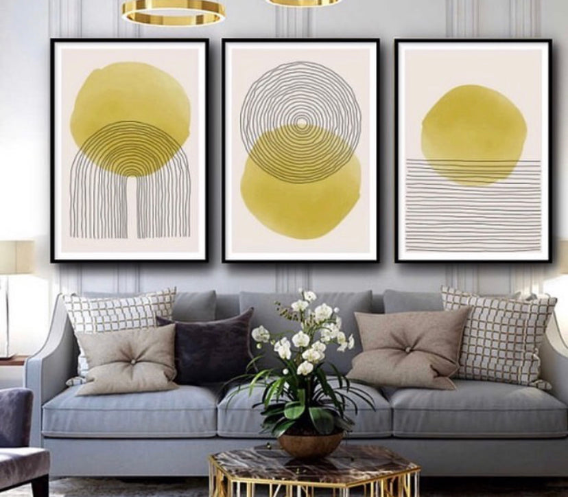 Set de 3 cuadros abstractos soles amarillos y lineas