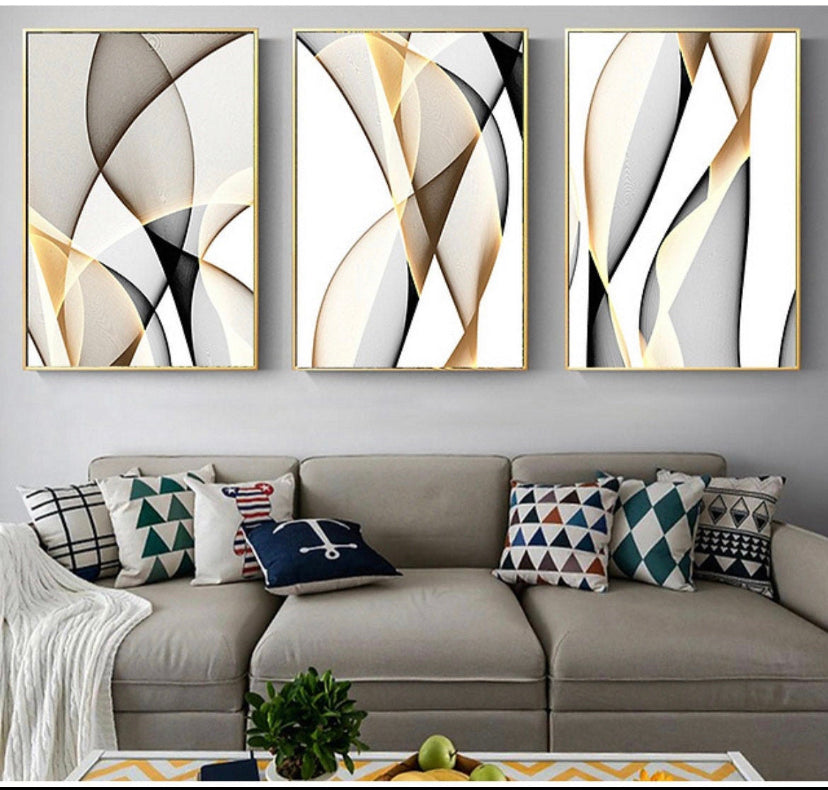 Set 3 Cuadros abstractos líneas doradas