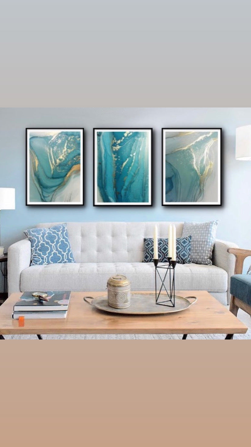 Set de 3 cuadros abstractos en tinta alcohol , turquesas y dorados