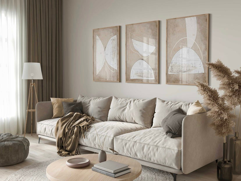Set de 3 cuadros abstractos en tonos neutros beige , palmas
